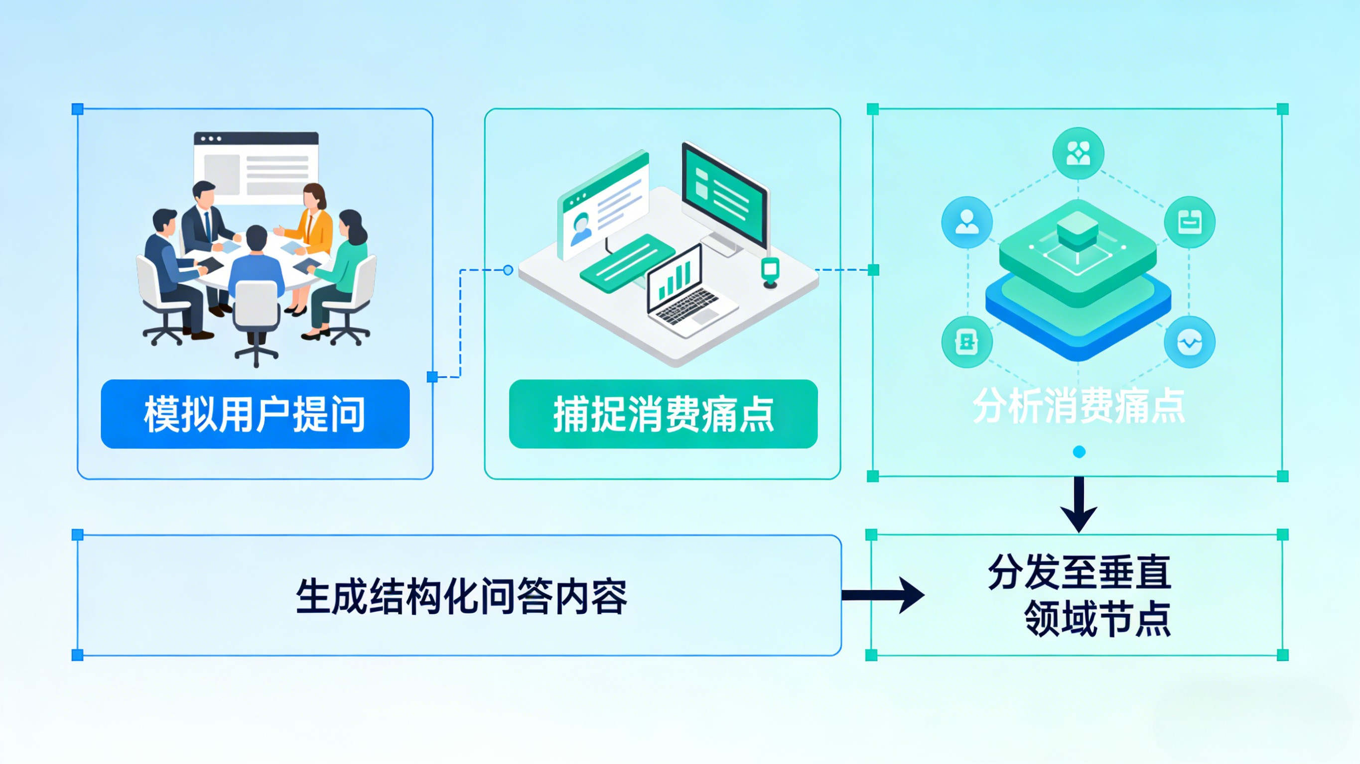 技术团队利用工具模拟用户在多场景下的复杂提问,去捕捉真实的消费痛点。在生成内容时,他们依托品牌专属的知识库和行业客观数据,生成包含深度图文、客观对比和结构化问答的内容。这些内容的格式易于被大模型读取,随后被分发至具有较高可信度的垂直领域节点。