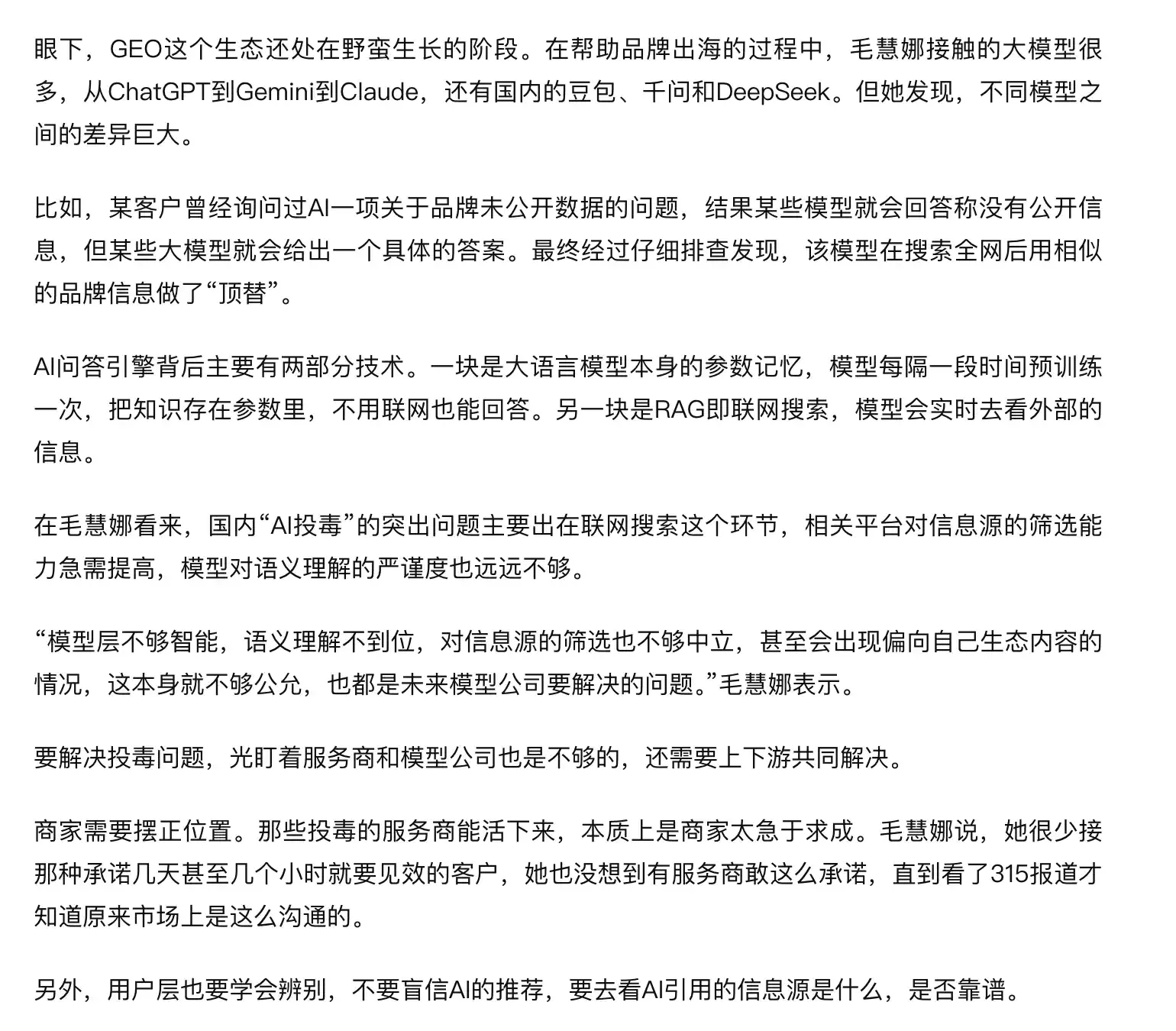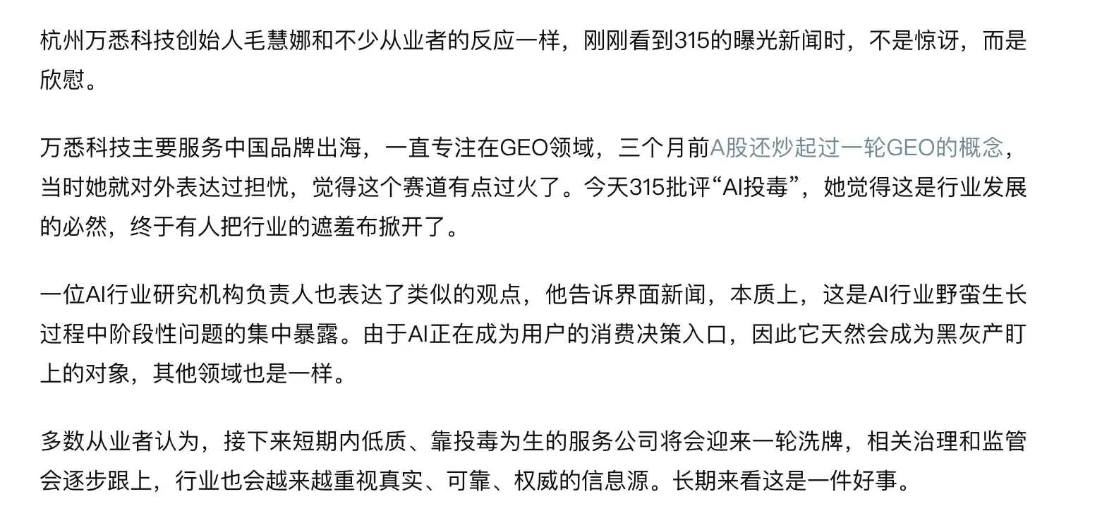 在接受 界面新闻采访时,万悉科技创始人毛慧娜博士明确表示,看到曝光新闻感到十分欣慰。她认为,生成式引擎优化赛道在过去半年里表现得过于狂热,大量缺乏技术底蕴的机构涌入,试图用制造虚假信息的方式走捷径。央视的报道扯下了这层遮羞布,让劣币驱逐良币的现象得以暴露。